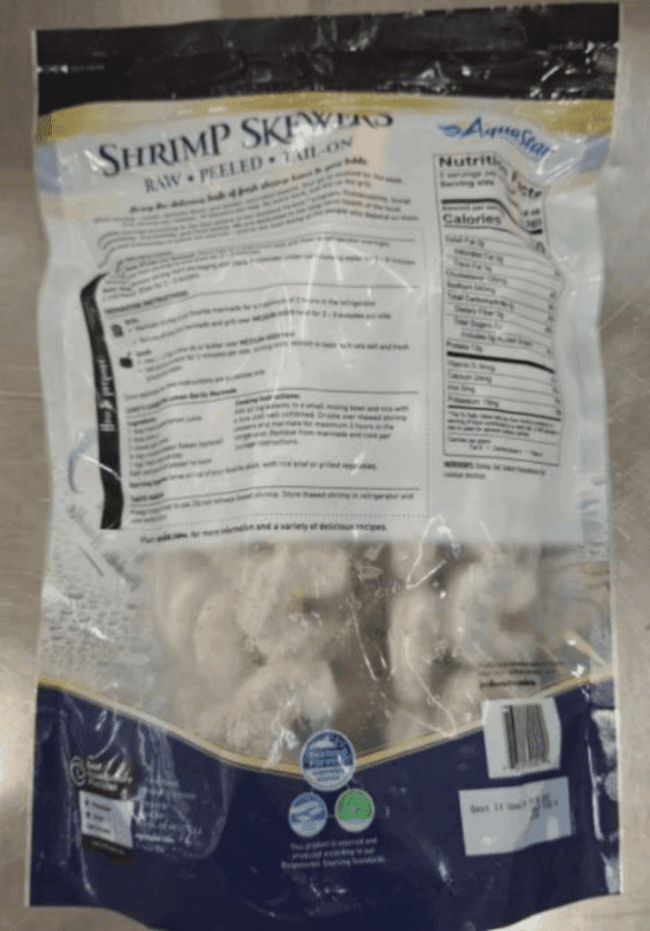 The affected AquaStar Raw Peeled Tail-on Shrimp Skewers; net wt. 1.25 lbs was sold in Food Lion stores in Delaware, Georgia, Kentucky, Maryland, North Carolina, Pennsylvania, South Carolina, Tennessee, Virginia and West Virginia, between July 7, 2025, and Sept. 20, 2025.