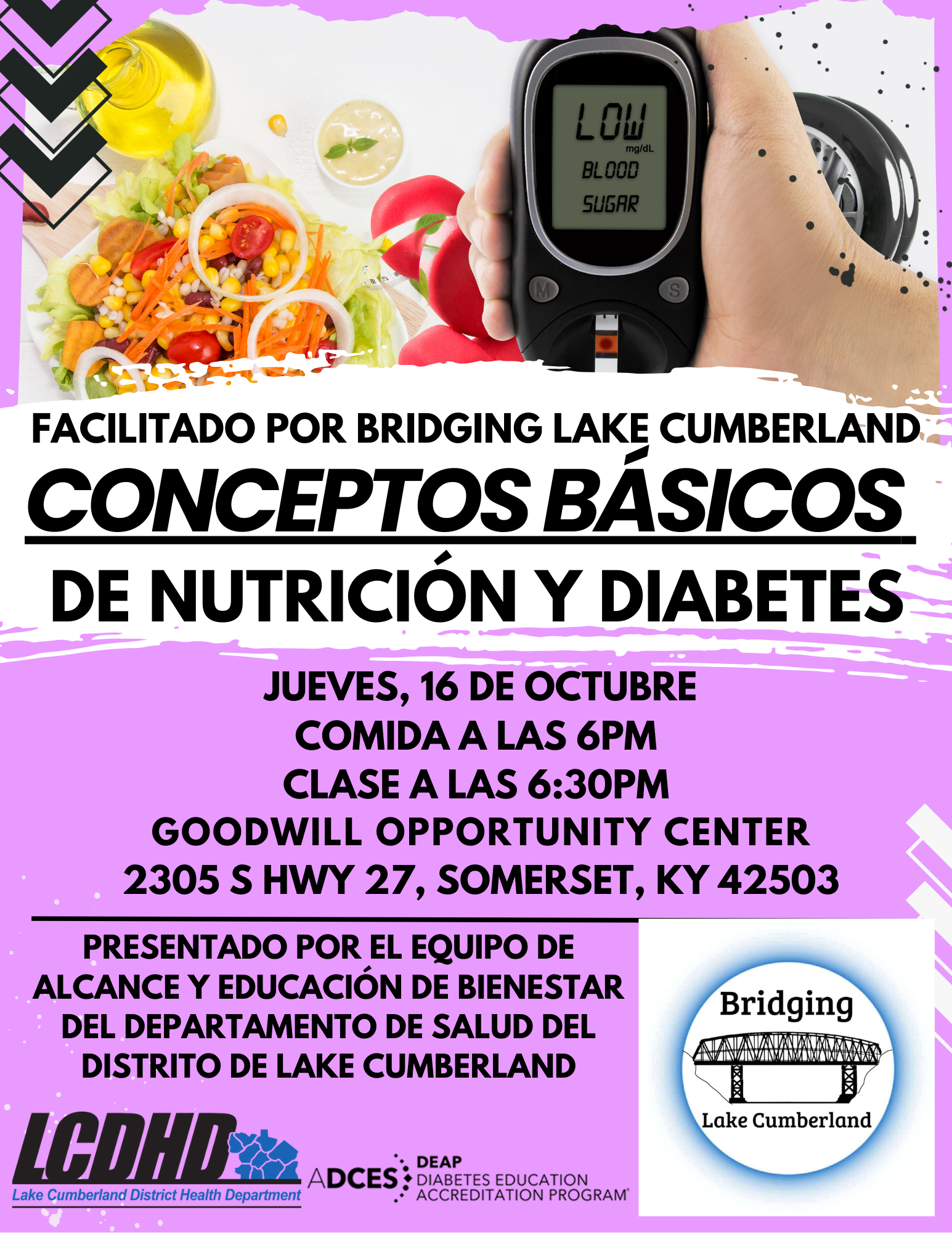 El programa de educación de la diabetes de LCDHD proporciona educación de diabetes en cada uno de los 10 condados en el distrito. Las educadoras ofrecen clases completas de auto manejo de diabetes sin costo, más oportunidades para clases por la tarde en algunos condados. Las educadoras también proveen educación para prevenir la diabetes dentro de la comunidad en las escuelas, ferias de salud, centros para los ancianos, y eventos en las comunidades. El programa educativo de diabetes se esfuerza en enseñar a individuos como controlar la diabetes y vivir vidas más saludables. ¡Estamos aquí para ayudar!