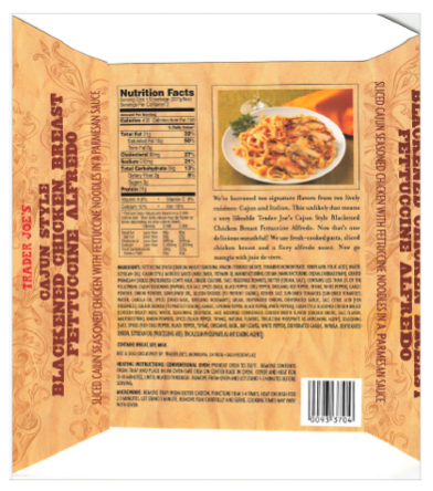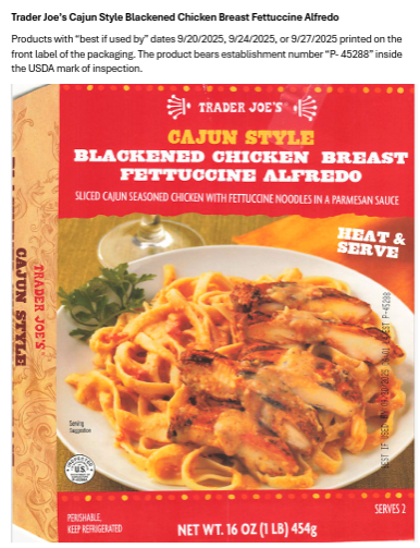 - Sold at Trader Joe’s: 16-oz. plastic tray packages labeled “TRADER JOE’S CAJUN STYLE BLACKENED CHICKEN BREAST FETTUCINE ALFREDO” with “best if used by” dates 9/20/2025, 9/24/2025, or 9/27/2025 printed on the front label of the packaging. The product bears establishment number “P- 45288” inside the USDA mark of inspection. [view labels]