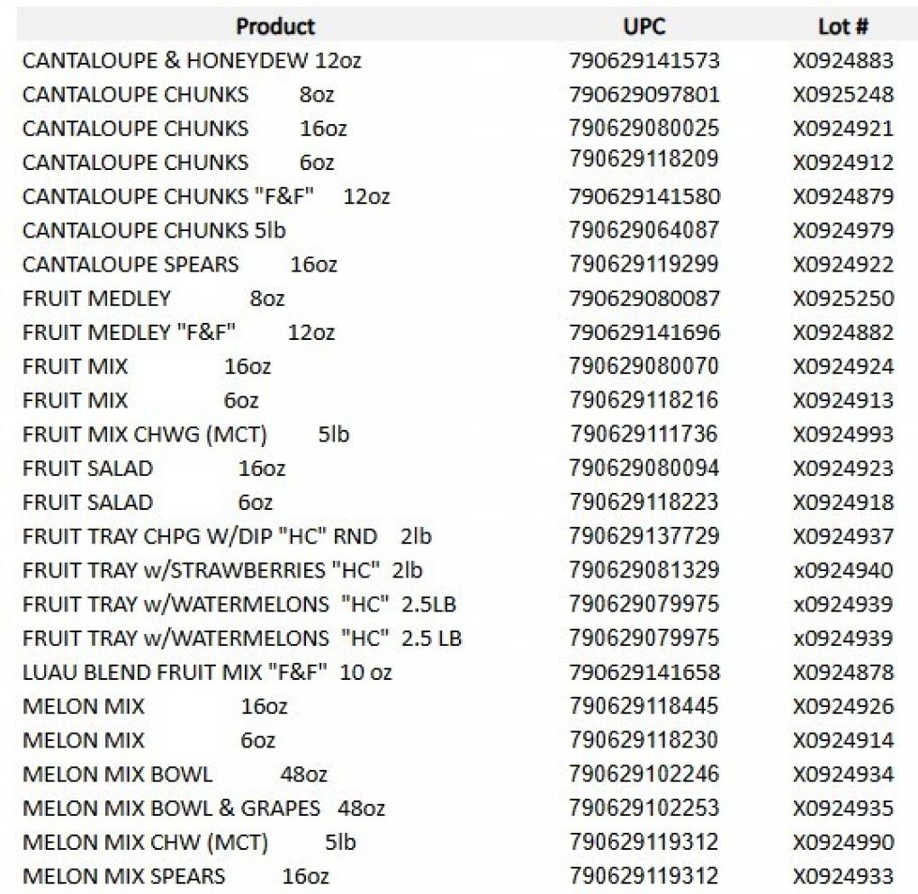 Fresh Cut cantaloupe was sold in traditional plastic clamshell containers under the “Harvest Cuts” & Fresh & Finest” label in both cantaloupe-only products, as well as mixed containers that include other fresh cut-fruits.